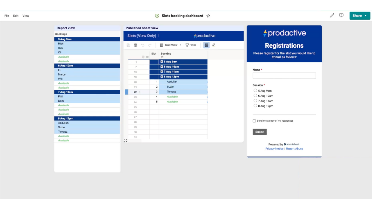 We love getting as much out of the Smartsheet platform as possible and showing others a little of what can be achieved with it. So here’s a solution we created for booking slots, for example spaces at a training event or a class.