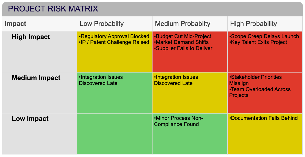Many teams reach a point where a simple RAID log isn’t quite enough. As delivery accelerates, senior stakeholders want to see not just the list of risks, but the pattern — what’s low probability but high impact, what’s clustering in the red, and where the conversation should really be focused. That’s where a risk matrix becomes useful: a grid that groups risks by probability and impact, and displays them clearly on a dashboard.